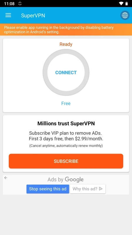 该应用程序是一款 免费软件,提供20天的免费试用版。试用期结束 后 ,您可以使用 每小时会话在一小时后 重新启动 VPN 。如果您想购买 订阅计划,则每月只需 2.99美元。
